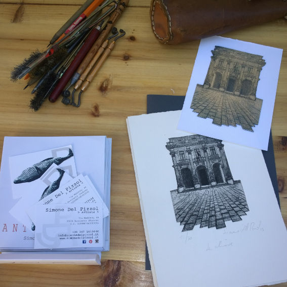 Giancarlo Busato mette il timbro della sua stamperia d'arte alle stampe delle incisioni di Simone su una carta marmorizzata